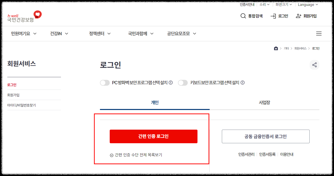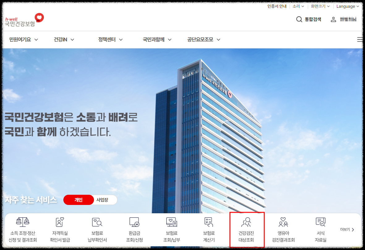 ➡️ 1. 국민건강보험공단 홈페이지로 이동하여 건강검진대상조회 클릭