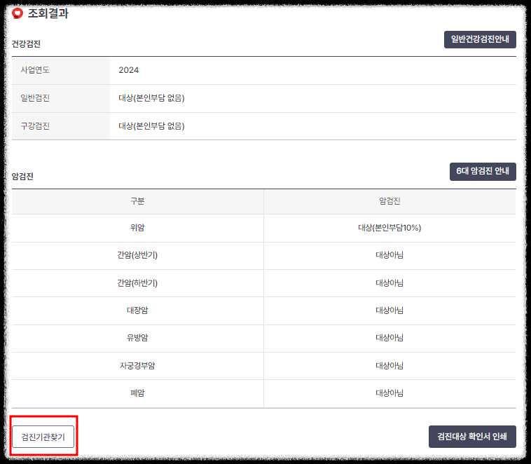 ➡️ 5. 검사항목 확인 후 닫기, 검진기관 찾기 클릭