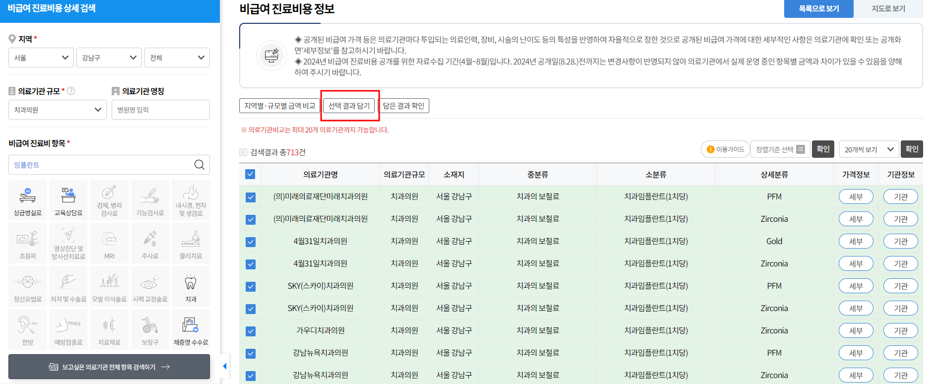 ➡️ 4. 보고 싶은 항목을 선택하여 선택결과담기를 실행합니다.